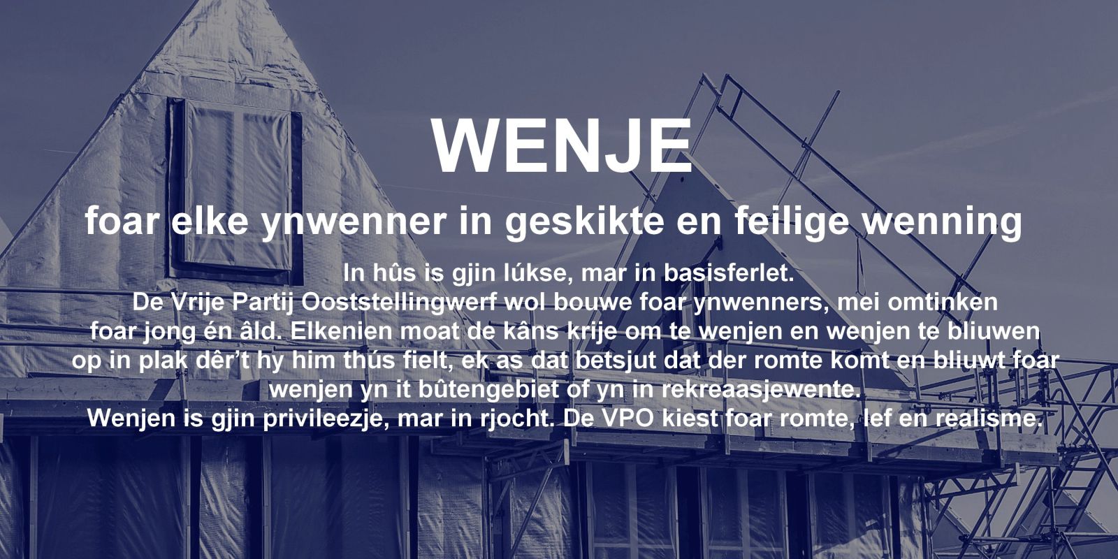 De Vrije Partij Ooststellingwerf (VPO) stiet foar sûn ferstân, lokale krêft en earlik bestjoer. Wy wolle in gemeente dy’t docht wat nedich is, net wat polityk winsklik klinkt. Wy lústerje nei ynwenners, boeren, ûndernimmers en ferienings — net nei Haachske regeltjes of provinsjale plannen. De VPO makket karren dy’t goed binne foar Ooststellingwerf, mei lef, logika en belutsenheid. De ynwenners fan Ooststellingwerf fertsjinje in bestjoer dat ferantwurdlikens nimt, lústeret nei de praktyk en mei minder regels mear berikt.